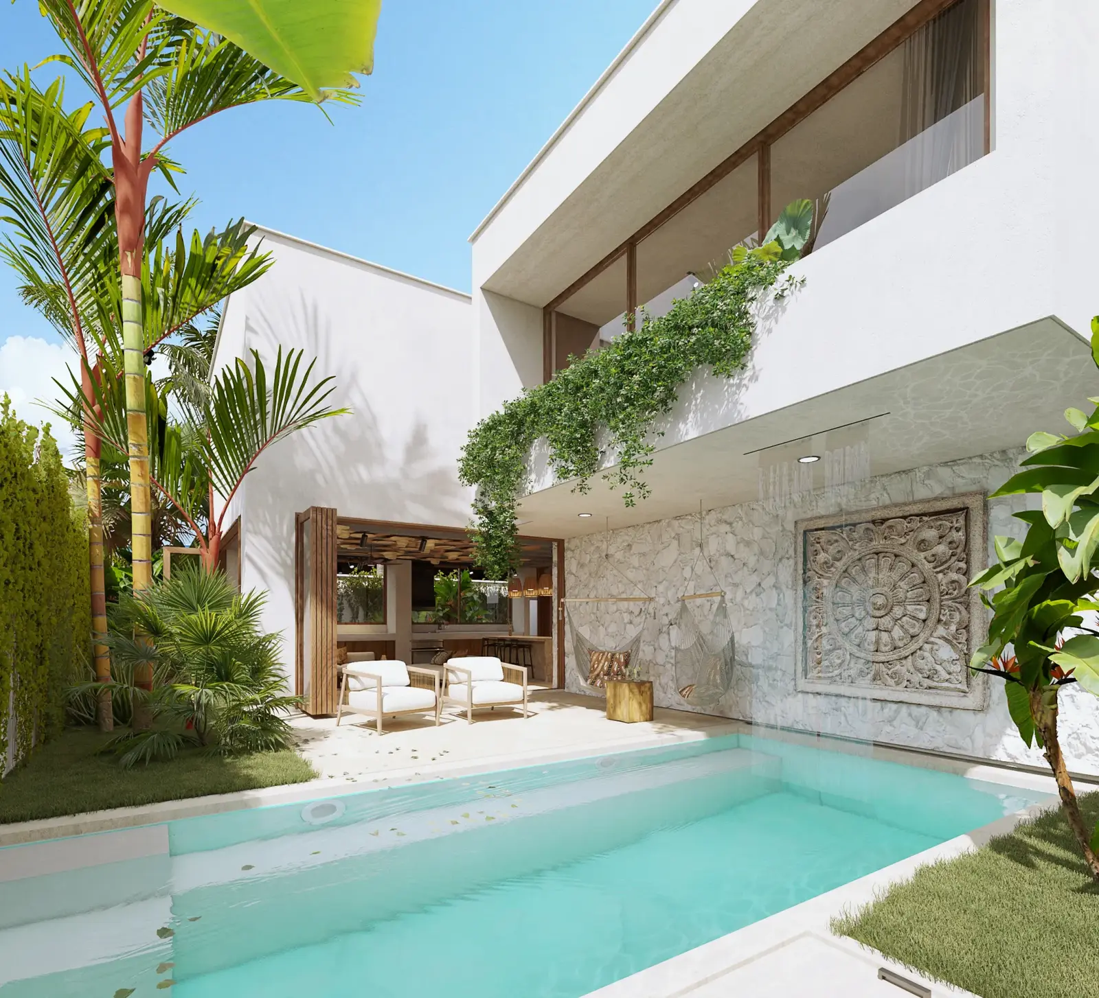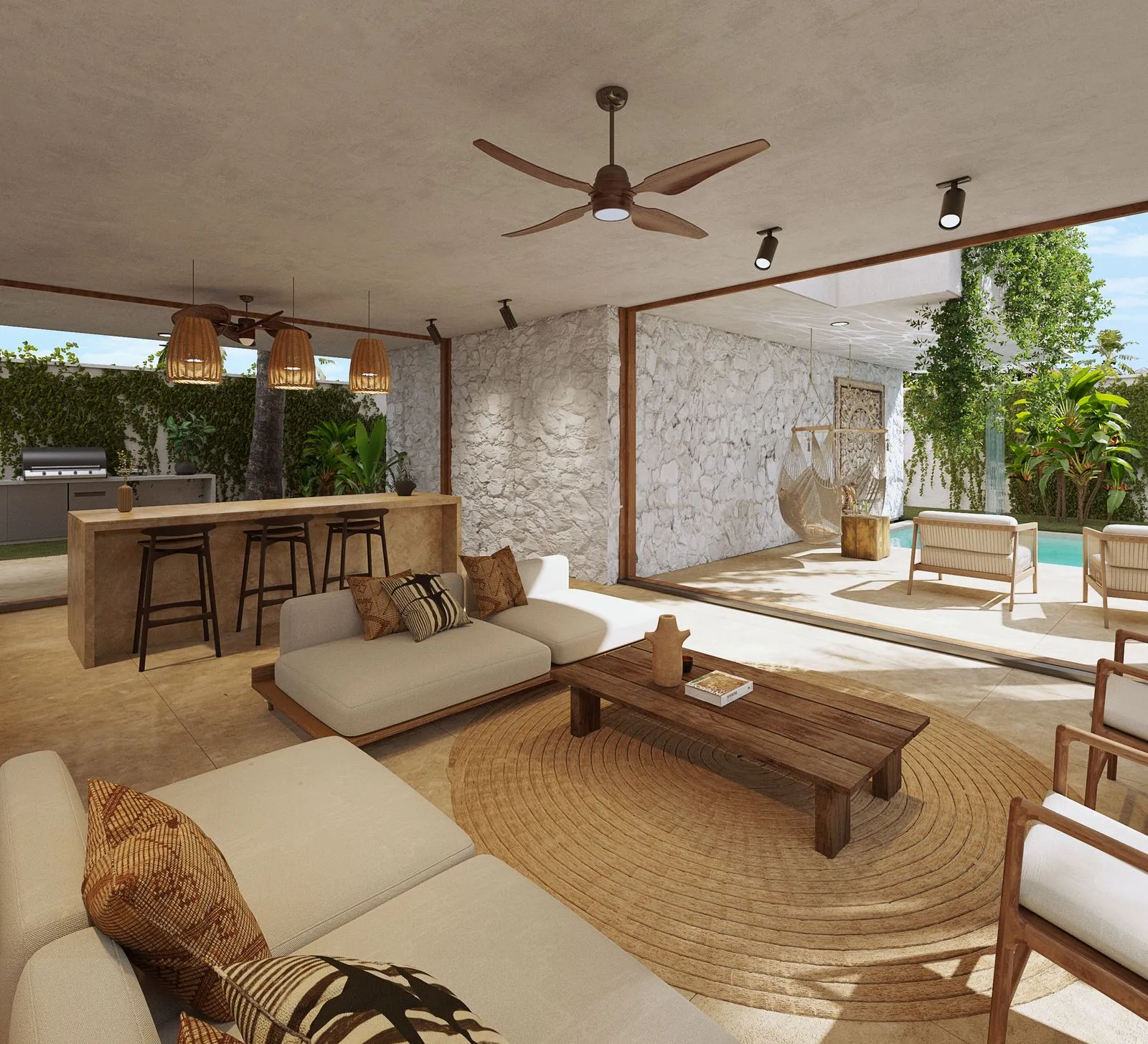 La propriété comprend une piscine privée, un garage, une chambre de sécurité et un ameublement complet, conçus pour une vie intérieure-extérieure harmonieuse.